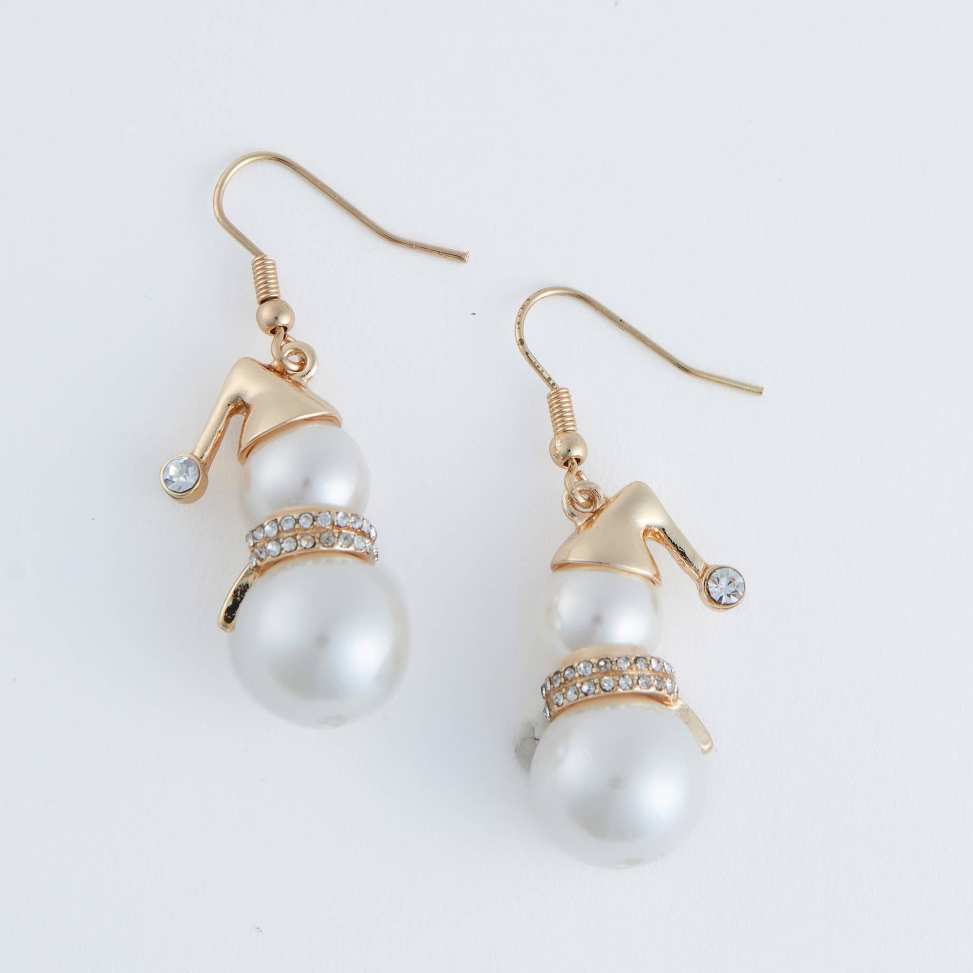 Holiday Christmas Snowman Pearl Gold Drop Earrings